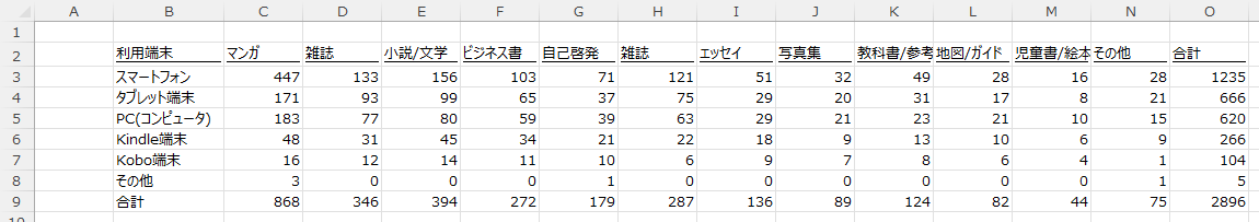 ここでは、電子書籍を読むときに用いるデバイスを聞くQ11(MA形式)を分析対象に、性別を聞くQ1(SA形式)を分析軸としたクロス集計を行います。