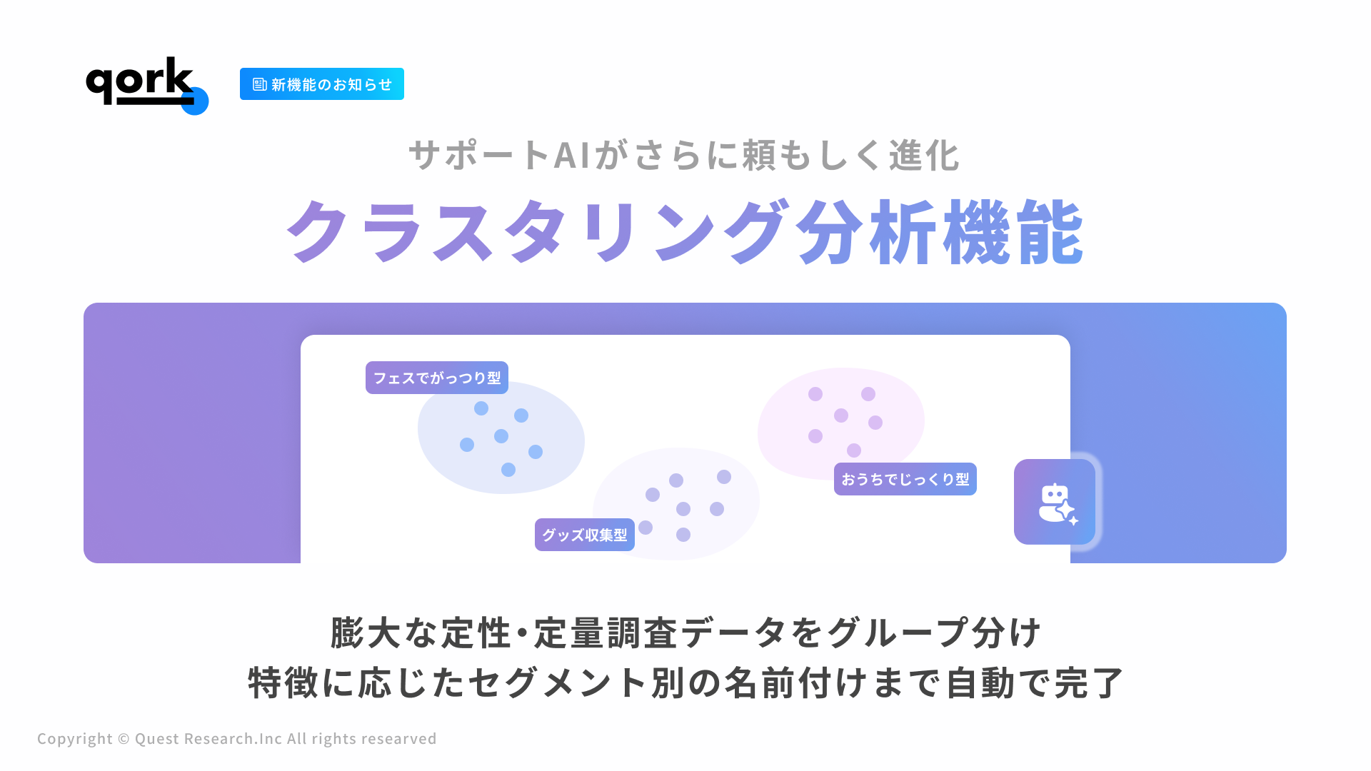 株式会社Quest Research(本社:東京都港区、代表取締役:南健太)は、生成AIを活用したインタビューサービス「qork(コルク)」に、新たにAIチャットベースのクラスタリング分析機能を追加したことをお知らせします。