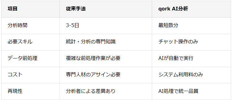 本機能により、アンケート調査で収集した数値データから、回答者のグループ(クラスタ)をAIが自動で発見・命名する「K-meansクラスタリング」を通じて、定量調査レベルの高精度な顧客セグメント分析が可能となります。 従来、専門的なスキルと多大な時間を要していたクラスタリング分析が、誰もがAIとのチャット操作だけで簡単に実行できるようになりました。これにより、分析工数を大幅に削減し、より迅速な意思決定をサポートします。