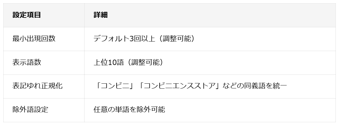 任意の自由回答カラムを選択するだけで、出現頻度に応じた文字サイズでワードクラウドを自動生成されます。助詞・助動詞の除去や、「コンビニ」「コンビニエンスストア」といった表記ゆれの正規化、「わからない」「特になし」などのノイズ語除外により、意味のある単語のみを抽出します。