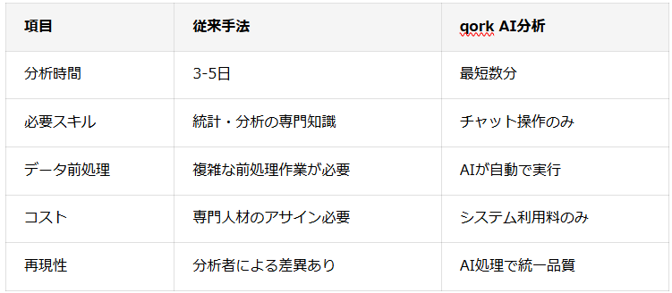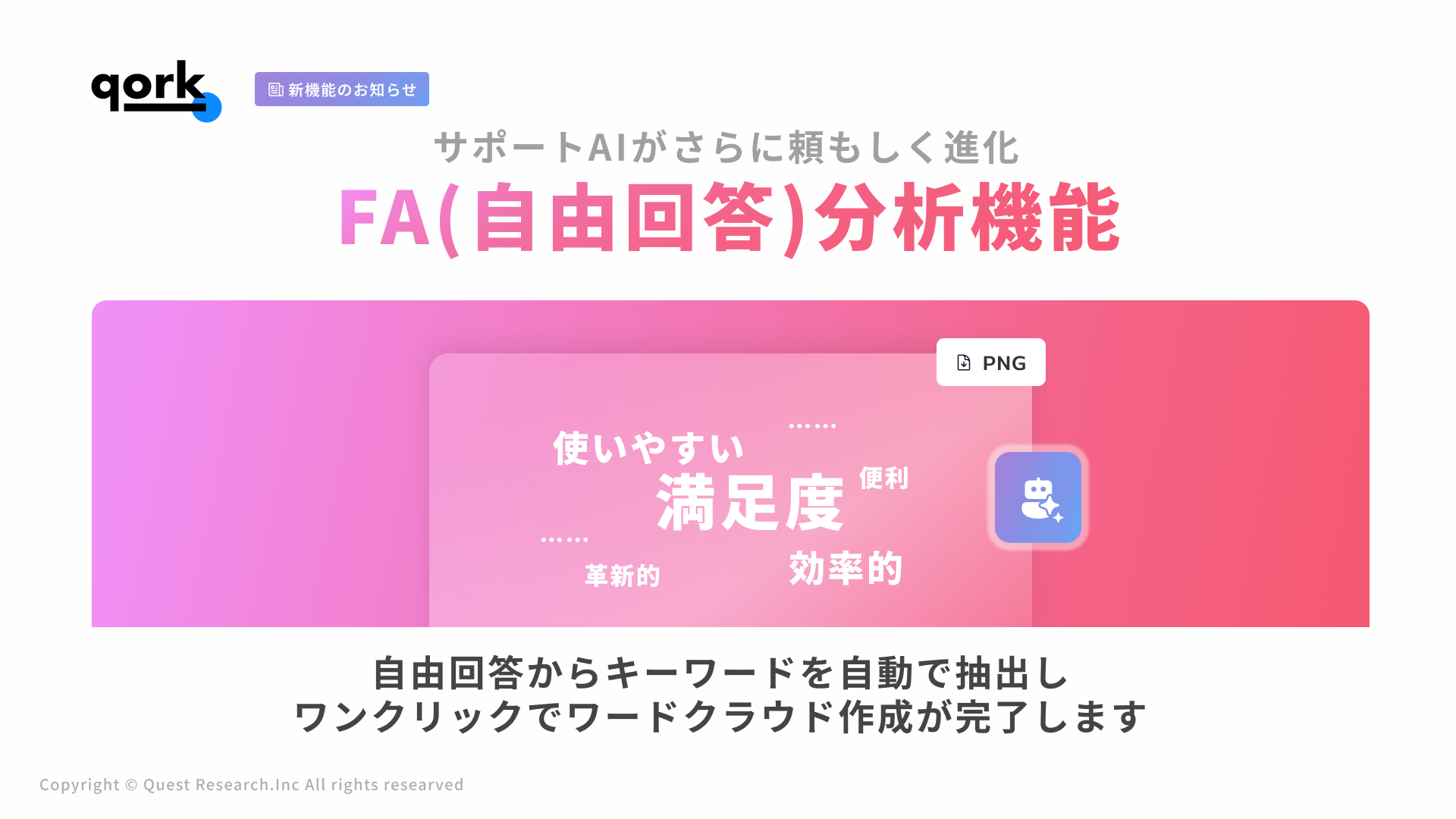 株式会社Quest Research(本社:東京都港区、代表取締役:南健太)は、生成AIを活用したインタビューサービス「qork(コルク)」に、新たにAIチャットベースのFA(自由回答)分析機能を追加したことをお知らせします。